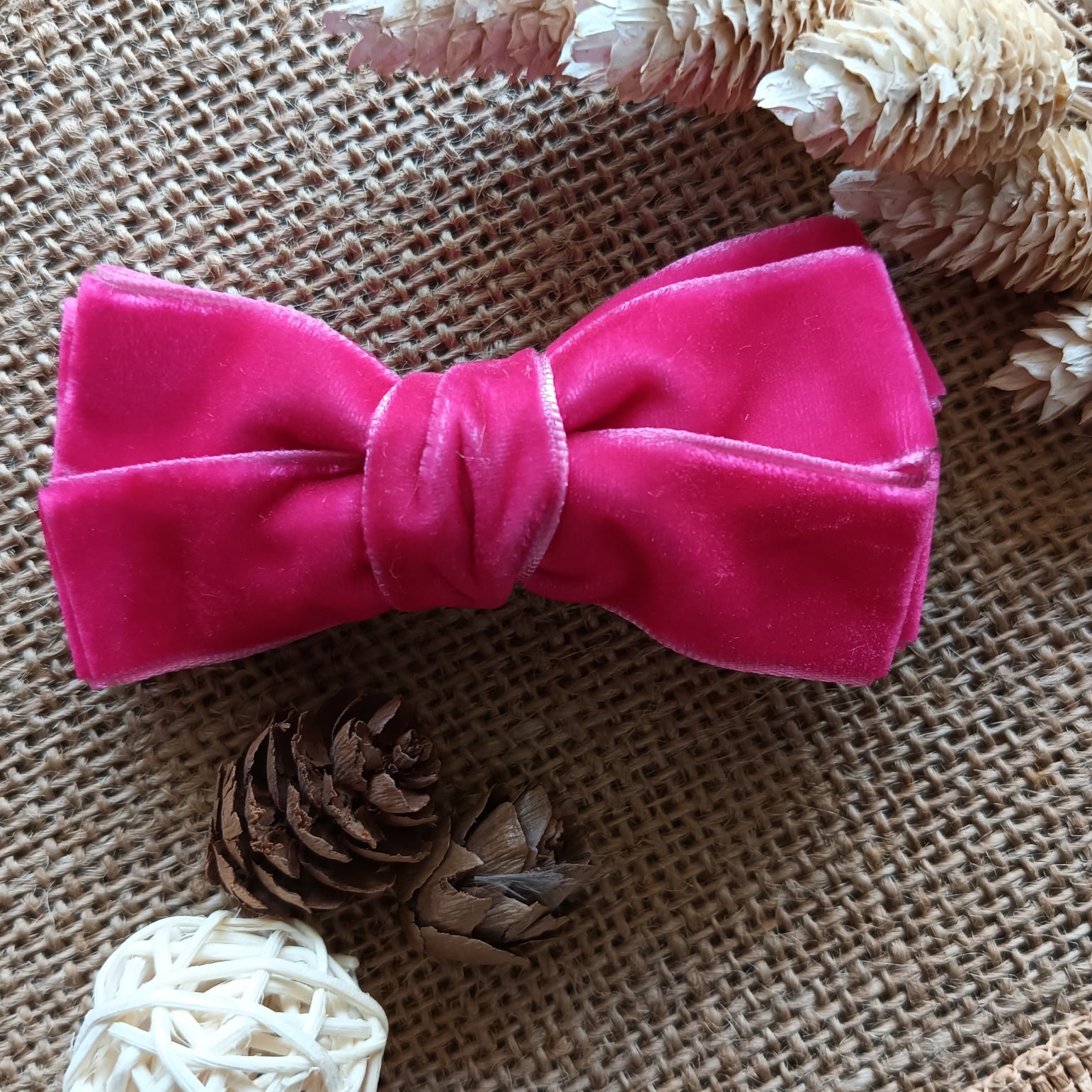 Lazo de pelo modelo mariposa doble, confeccionado con cinta de terciopelo fucsia de 2 cm de ancho. Sujeción con pinza cocodrilo.