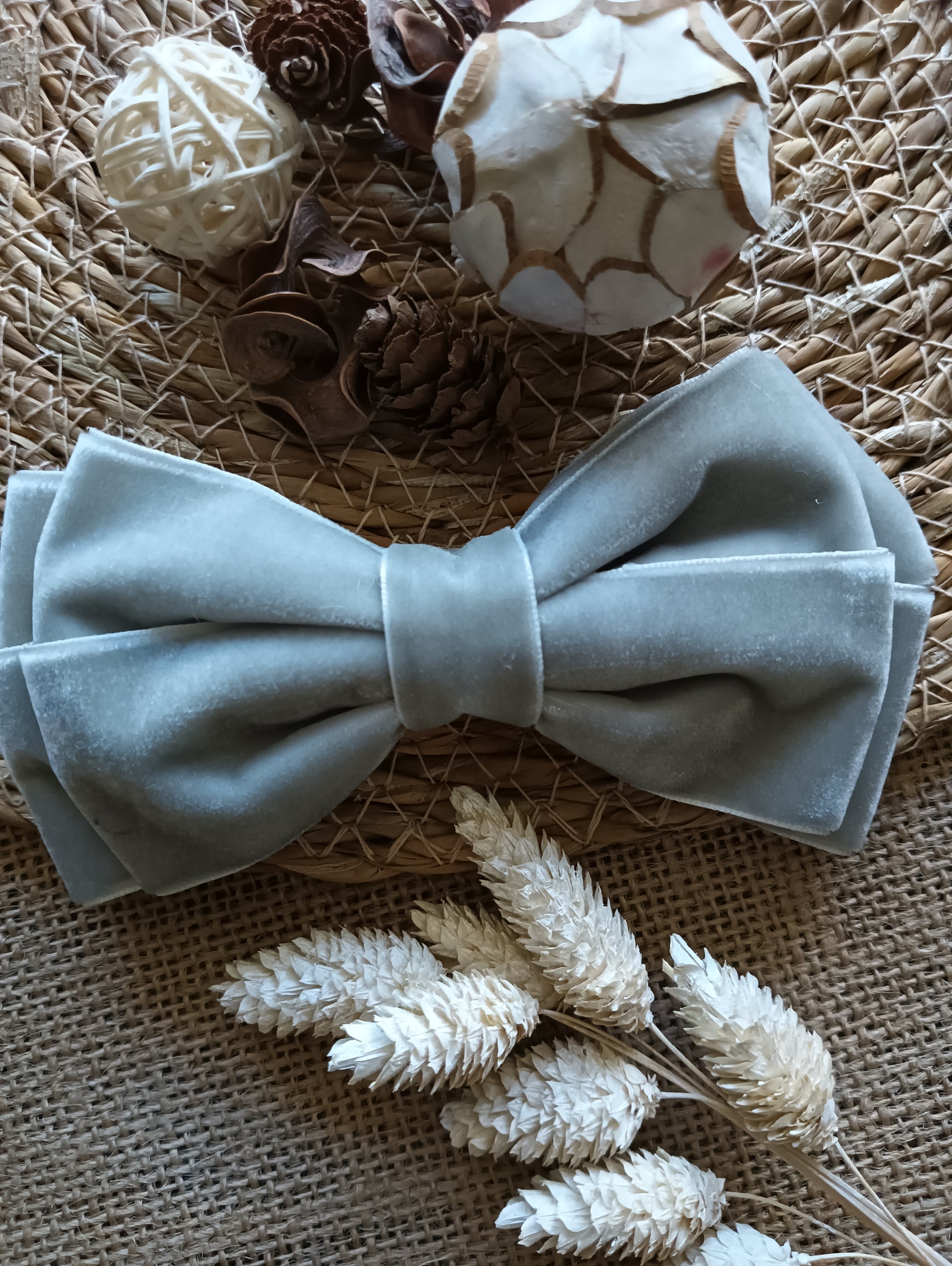 Lazo de pelo modelo mariposa doble, confeccionado con cinta de terciopelo gris de 4 cm de ancho. Sujeción con pinza cocodrilo.