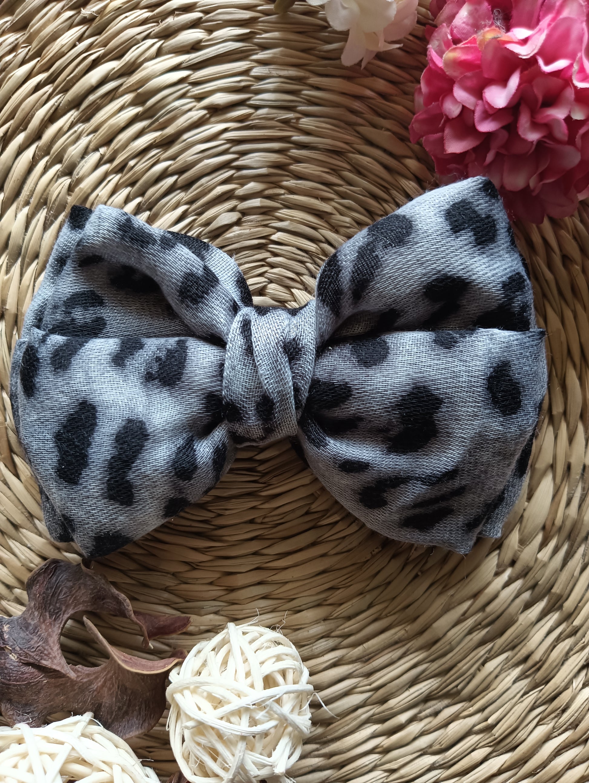 Lazo de pelo modelo mariposa doble, confeccionado con 2 lazos de tela con motivo animal print en tono gris.