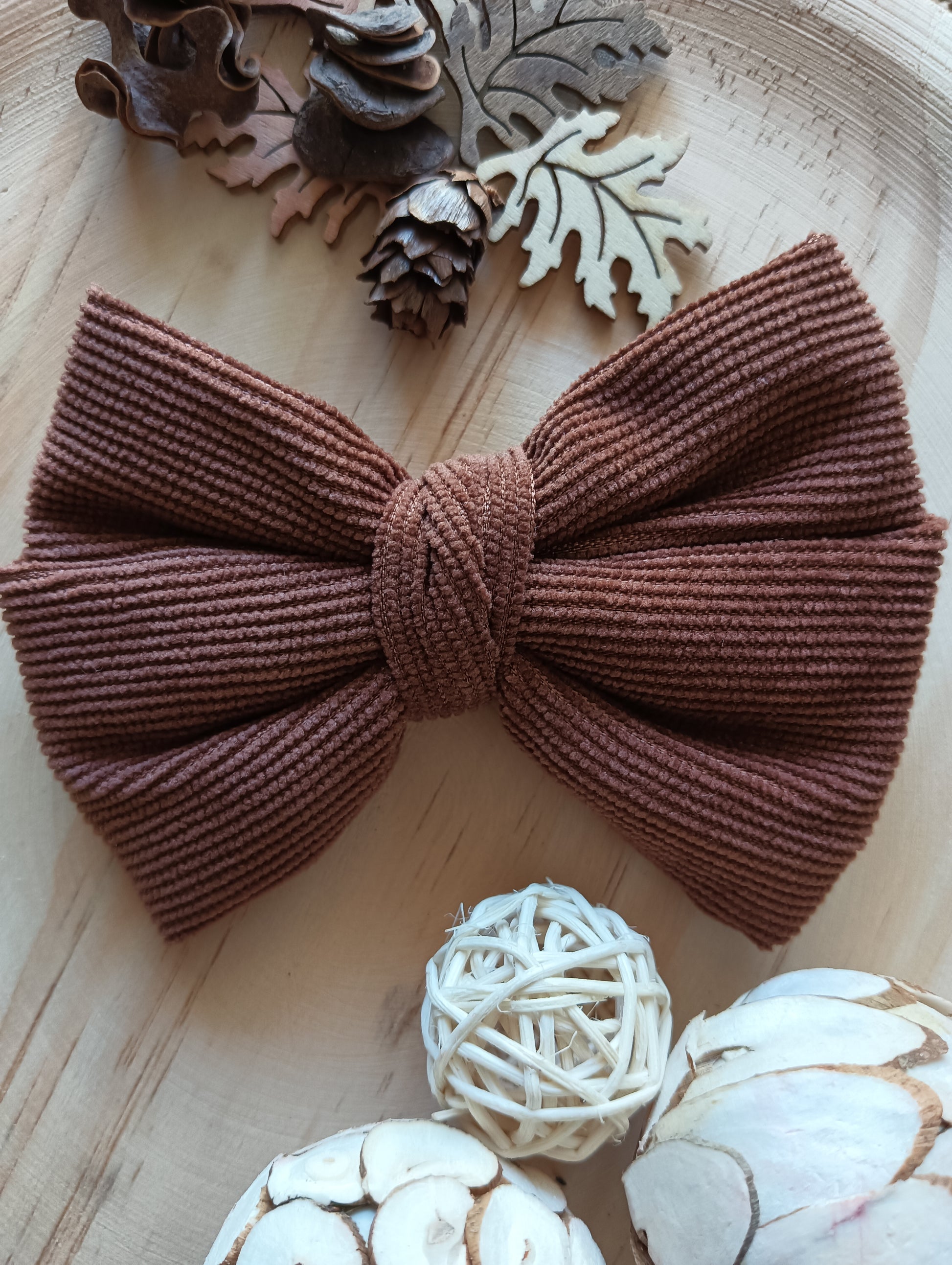 Lazo de pelo modelo mariposa doble, confeccionado con 2 lazos de tela de micropana marrón.